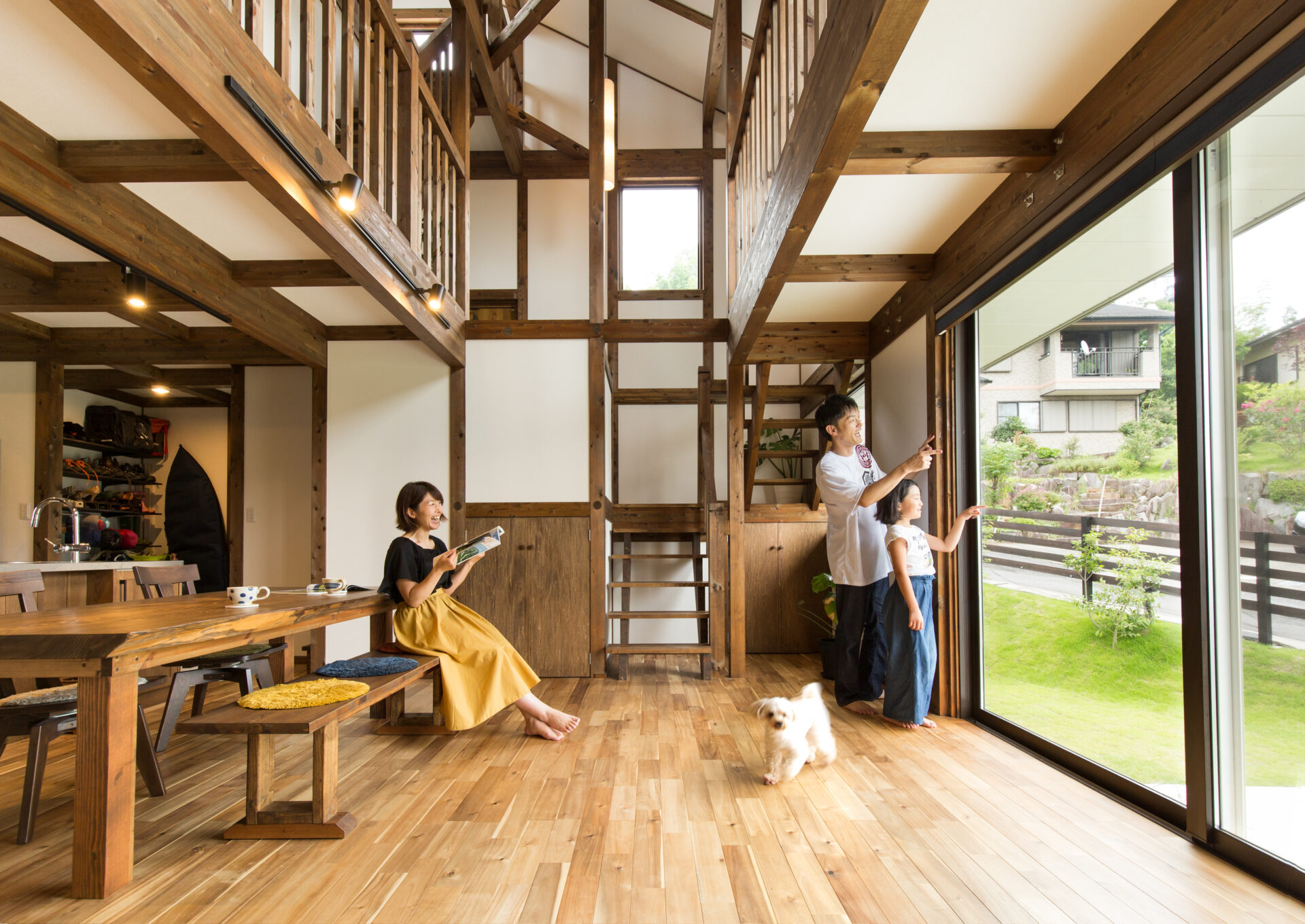 梁と柱が圧巻の、吹き抜けリビング