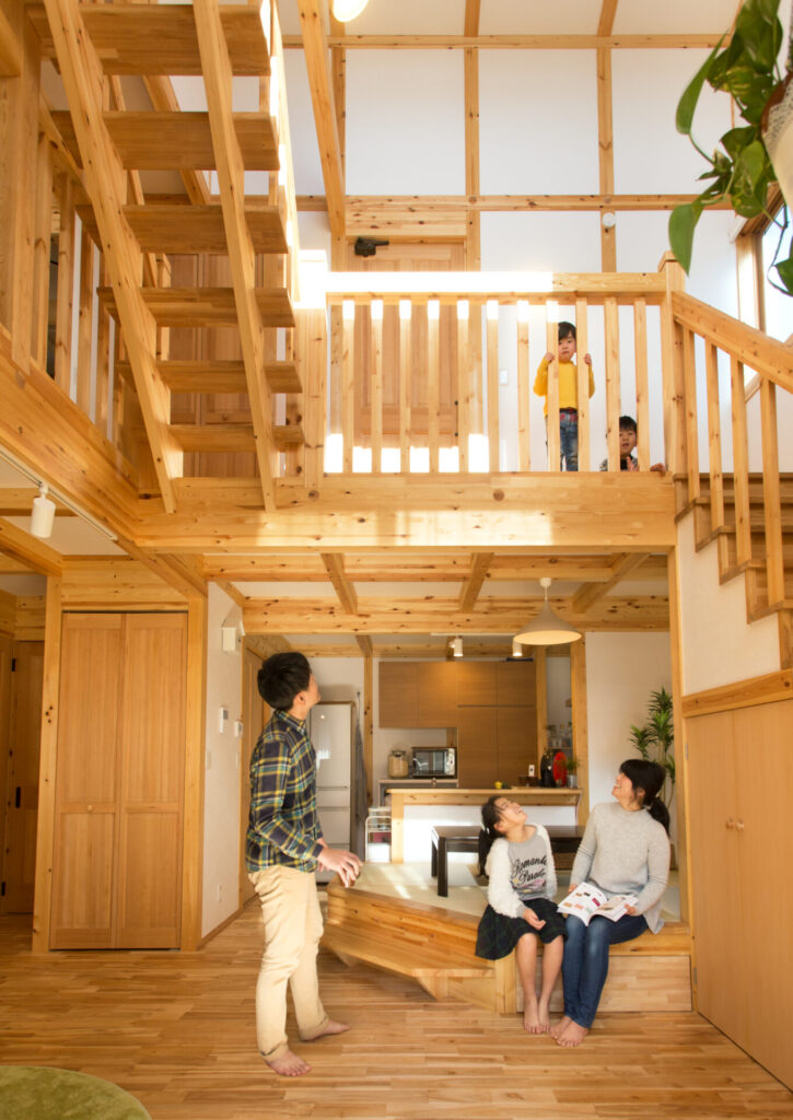 リビング階段が開放感を演出し、家族がどこにいても繋がります。木の温もりが家族を優しく包み込む設計です。