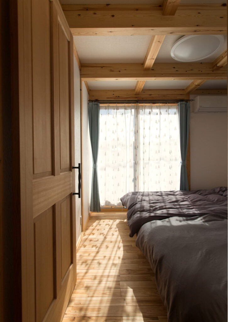 シンプルで落ち着いた雰囲気の夫婦の寝室。優しい光と木の温もりが、心地よい目覚めを届けます。