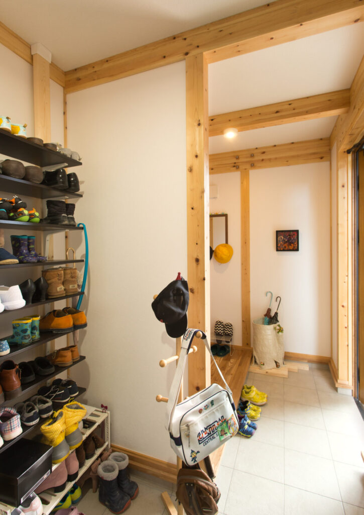 玄関横には大容量の土間収納を設置。家族の靴や外出時のアイテムもスッキリ片付き、玄関はいつも綺麗です。