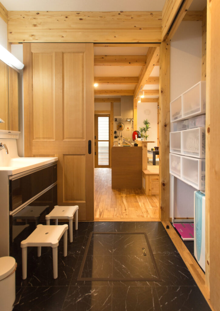 木の温もりあるLDKと、機能的な洗面室が隣接。家事をスムーズにし、デザイン性も両立した家族の時間を豊かにする設計です。