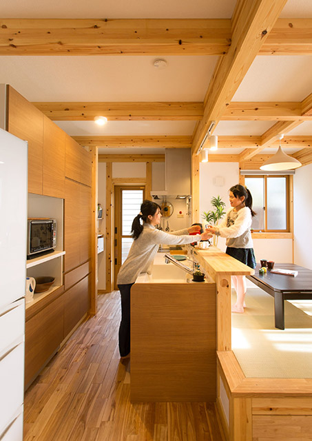 キッチンカウンターの向こうは小上がりのダイニング。料理をしながら、家族との会話やコミュニケーションが自然と生まれます。