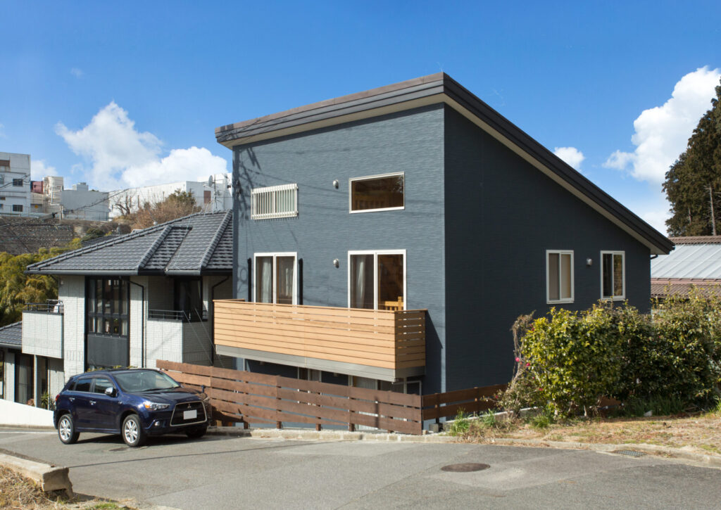 シャープな片流れ屋根と、温かい木製バルコニーが調和。飽きのこない、スタイリッシュなデザインです。