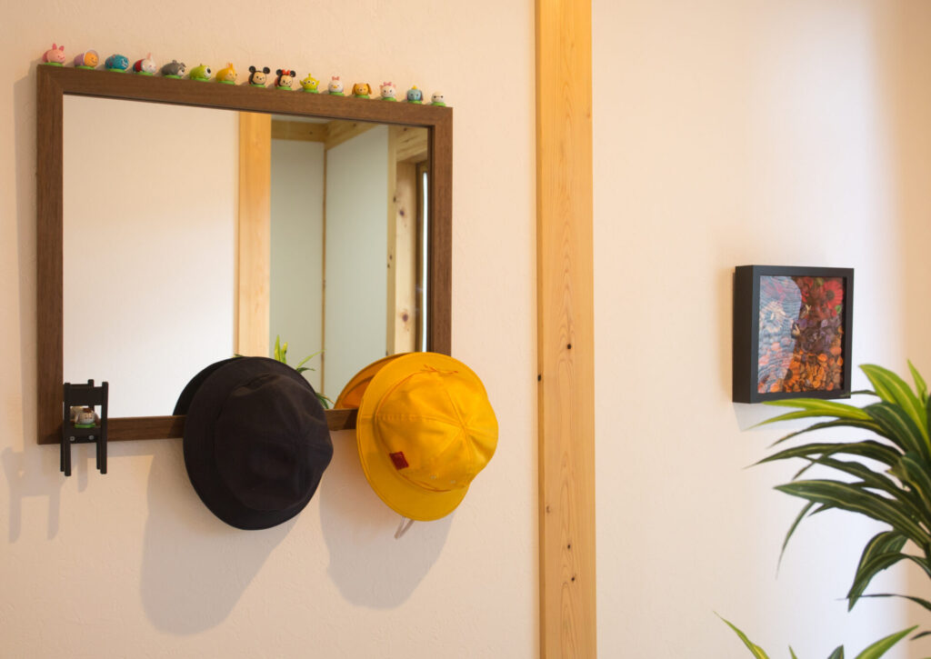 木の鏡に掛けられた帽子が微笑ましい玄関。家族の温かい日常が垣間見える、お気に入りのインテリアです。