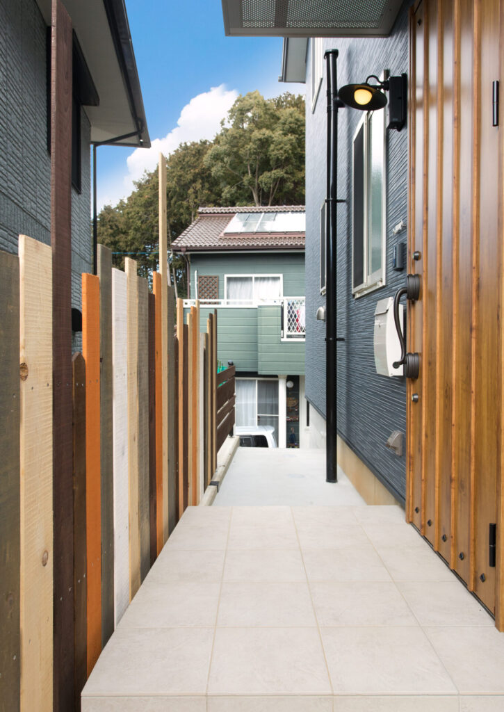 色とりどりの板塀が目を引く玄関先。木の温もりとモダンな外壁が調和した、遊び心のある玄関アプローチです。