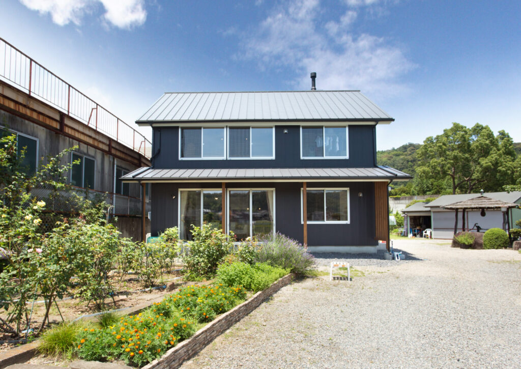 シャープでモダンな外壁と、緑豊かな庭が調和。大きな窓から土間やリビングへと繋がり、内外一体の暮らしを楽しめます。
