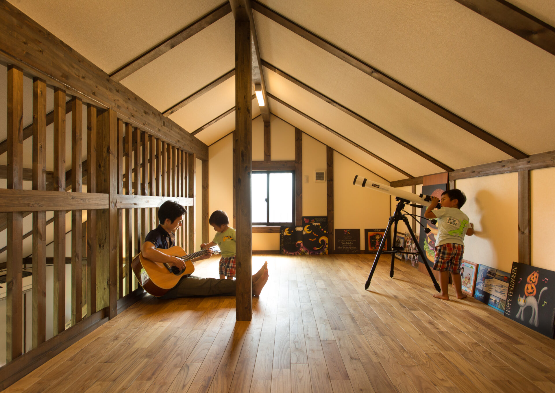 勾配天井の小屋裏は家族の秘密基地。ギターを弾いたり、望遠鏡を覗いたり、遊び心が広がります。