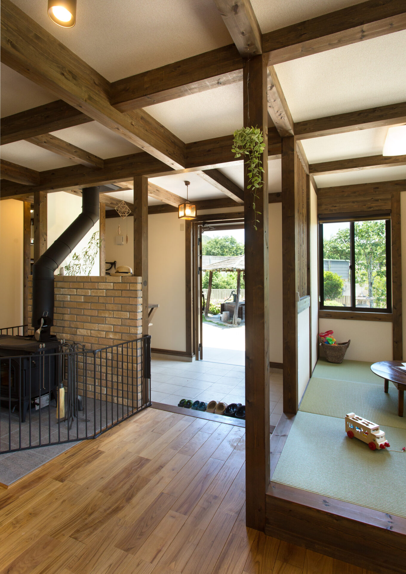 玄関から土間、そして畳の小上がりへと暮らしの幅を広げます。薪ストーブも、訪れる人を温かく迎えてくれます。