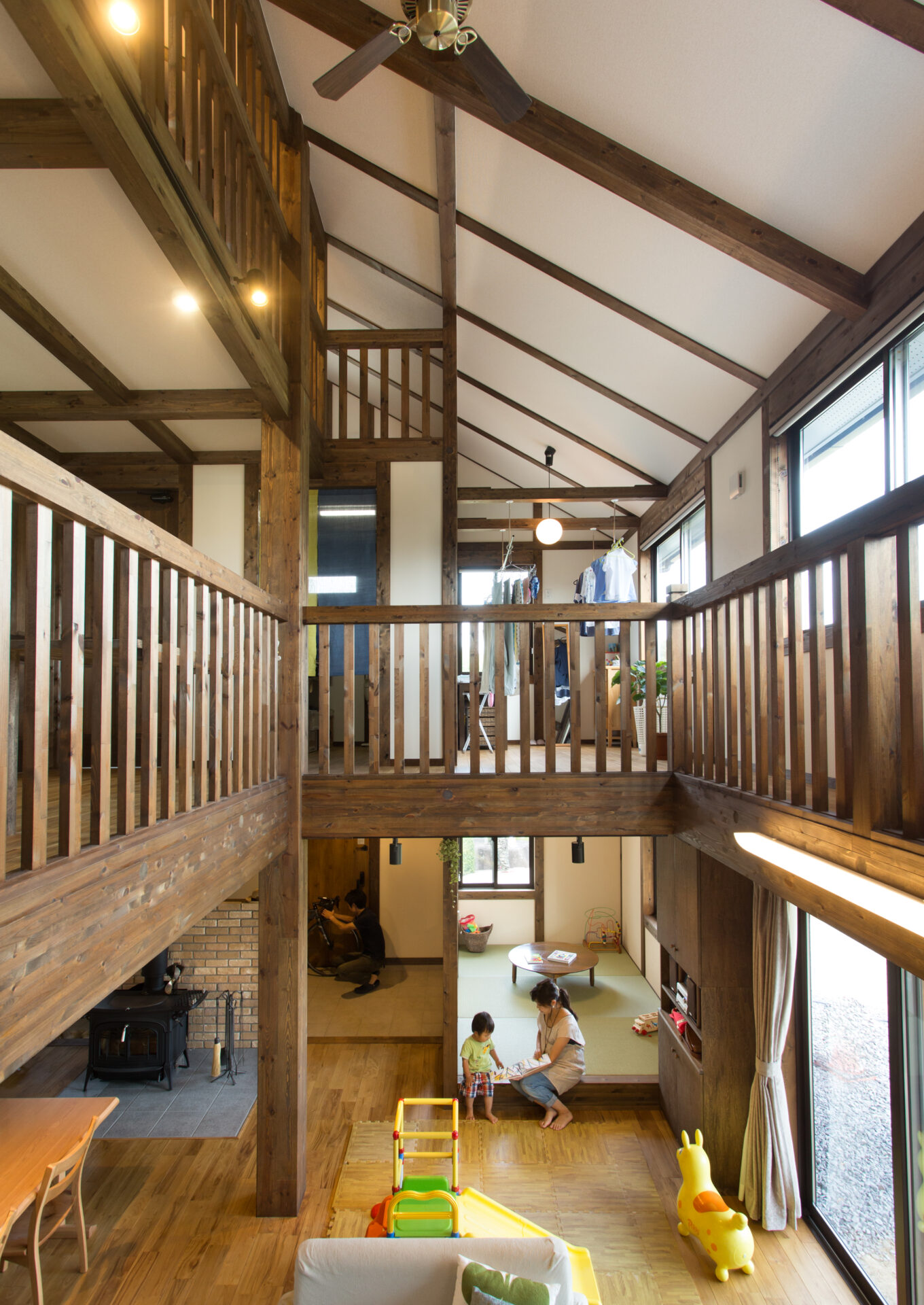 薪ストーブのある土間から2階まで続く大空間。勾配天井が、家全体に圧倒的な開放感をもたらします。
