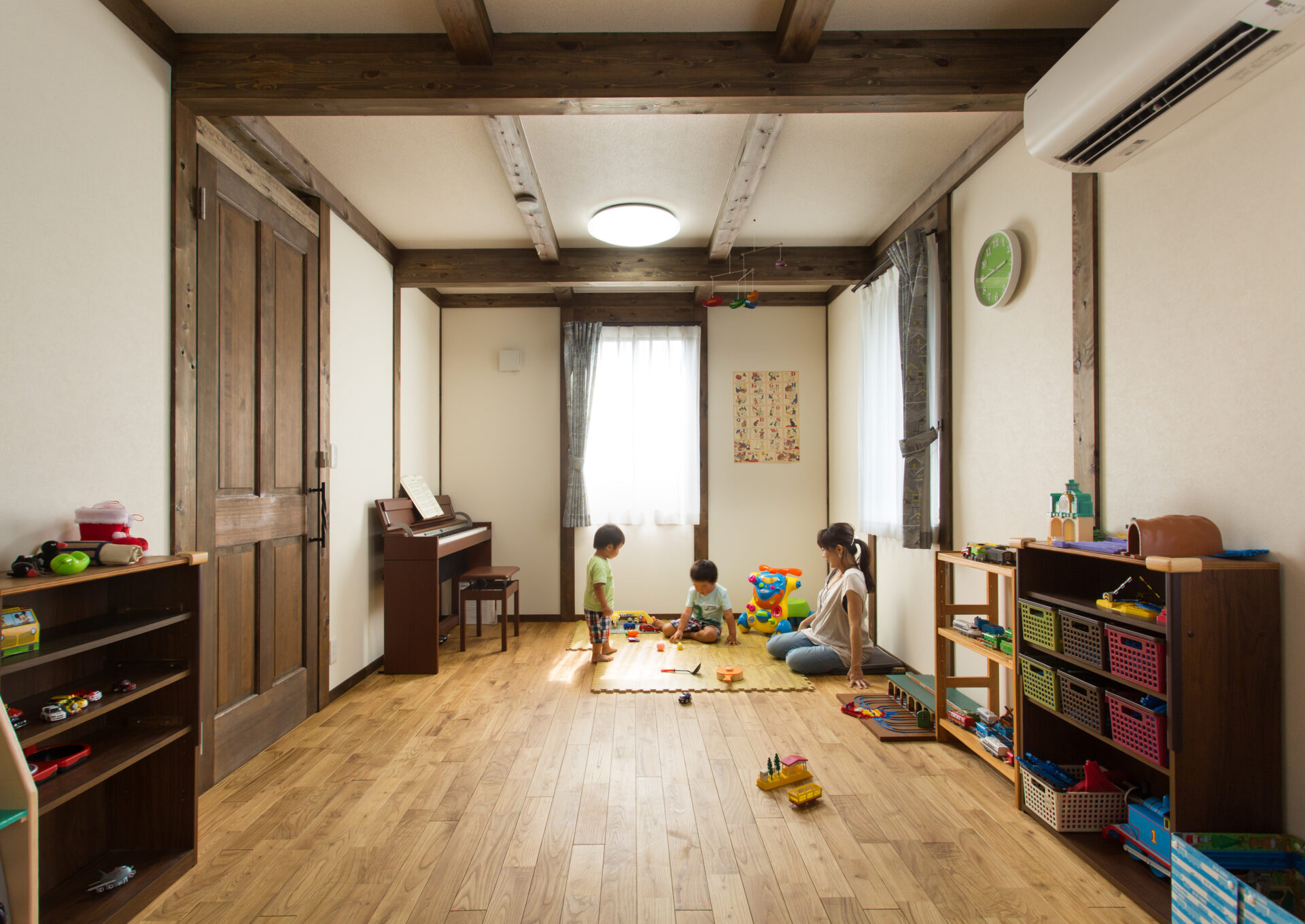 無垢材の床が心地よい、広々とした子供部屋。おもちゃを広げて、音楽を楽しんで、親子でのびのび遊べる空間です。