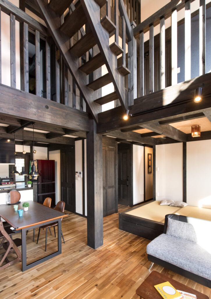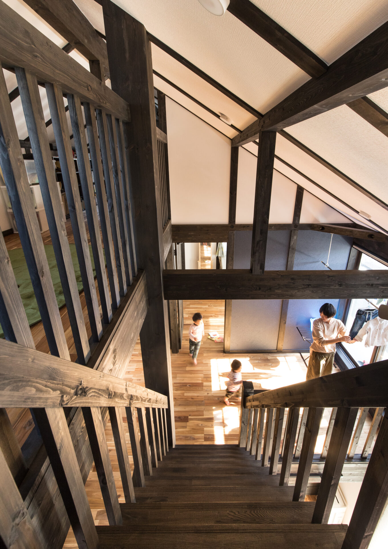 濃い梁と柱が家全体を繋ぐ。吹き抜けが開放感を生み出し家全体に統一感と落ち着きを与えます。