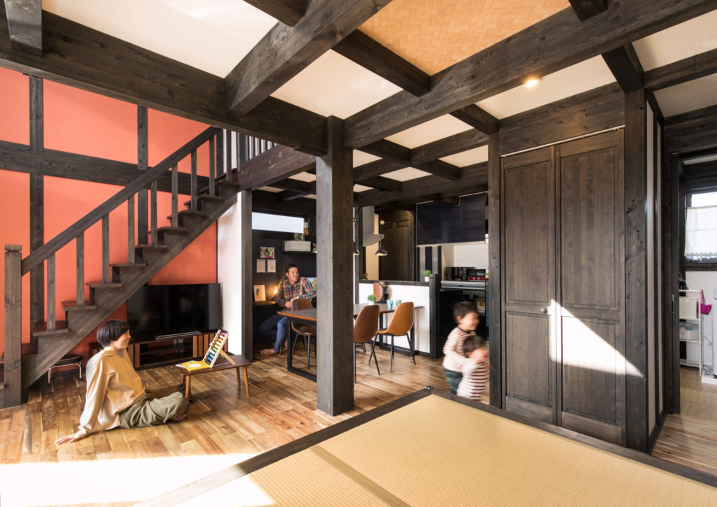 どこか懐かしさを覚える温かみのある懐かしい家でありながら、モダンな雰囲気もあるひのきの家。くつろげる小上がりの畳スペースがあり、見上げた時には美しい吹き抜けの階段。こだわった壁紙の赤色と黒く塗った柱。まるで、飛騨高山の旅館や古民家のような和モダンの木の家。