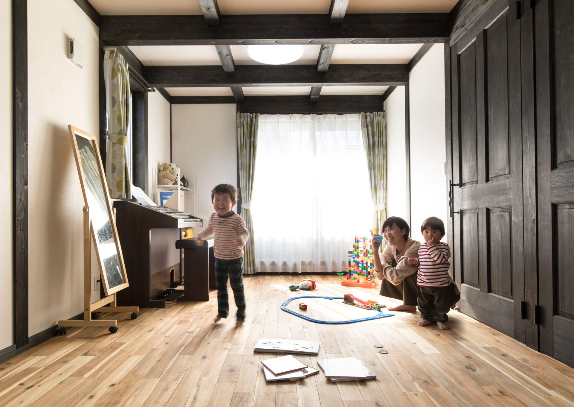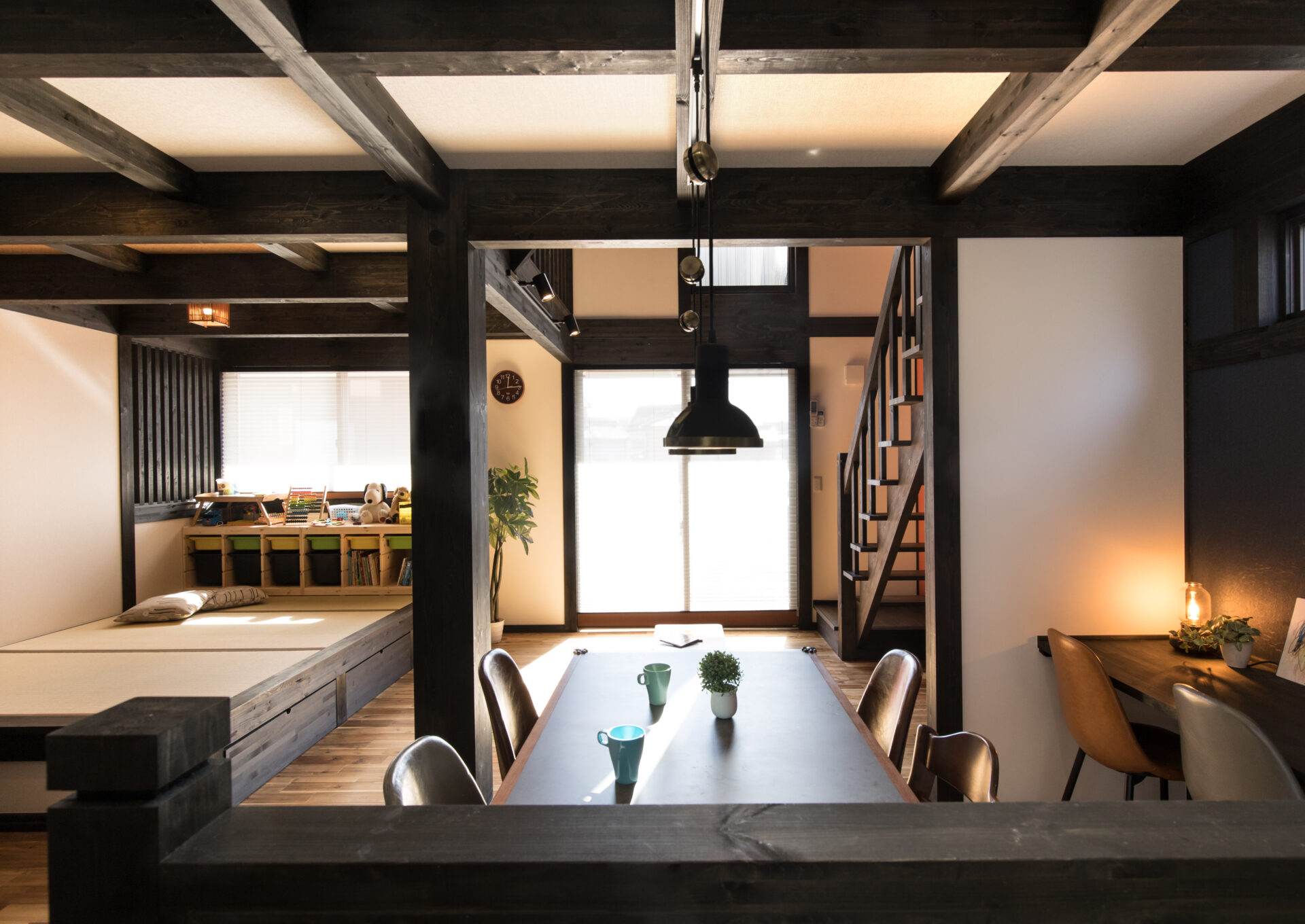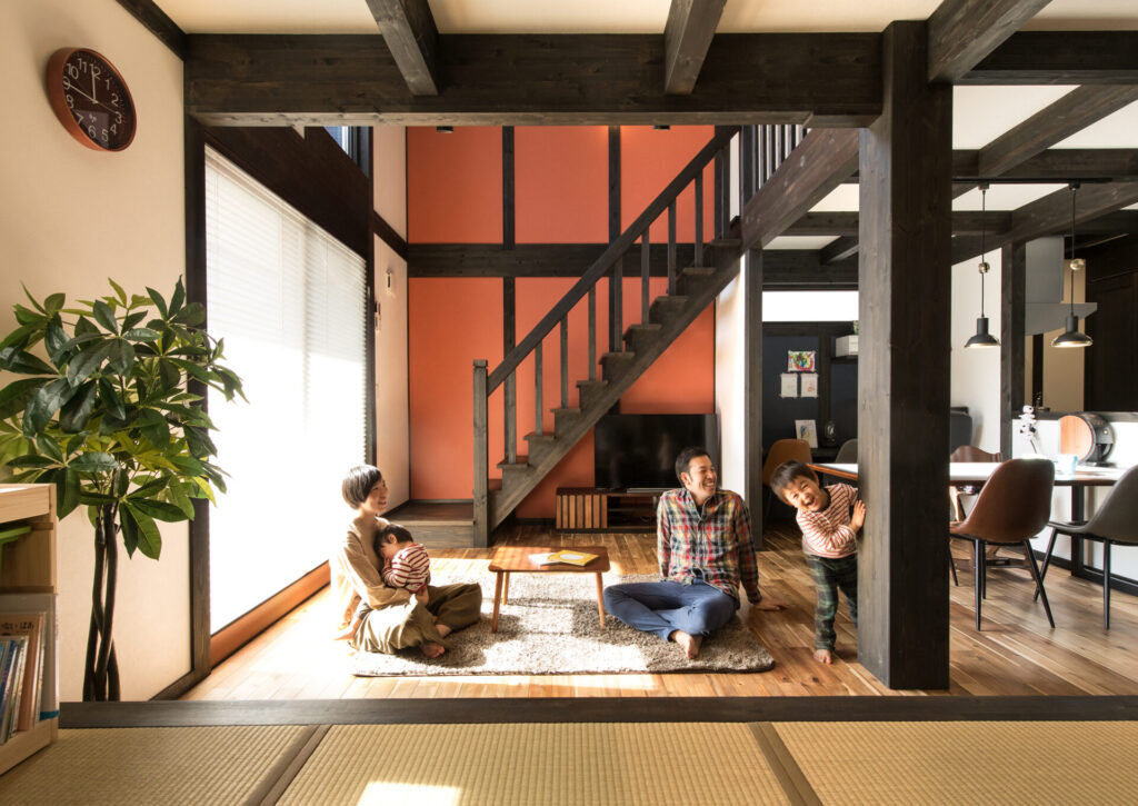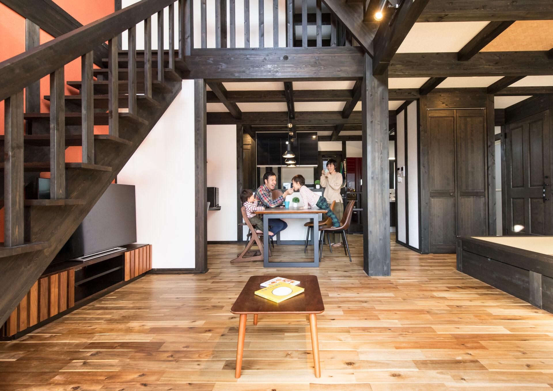 リビングスペースから家族の笑い声が響きます。濃色の梁が空間を引き締めるお洒落な住まいです。