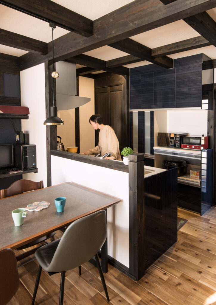 濃色の梁と黒いキッチンが調和した空間。デザイン・機能美にもこだわり、毎日の家事を楽しくします。