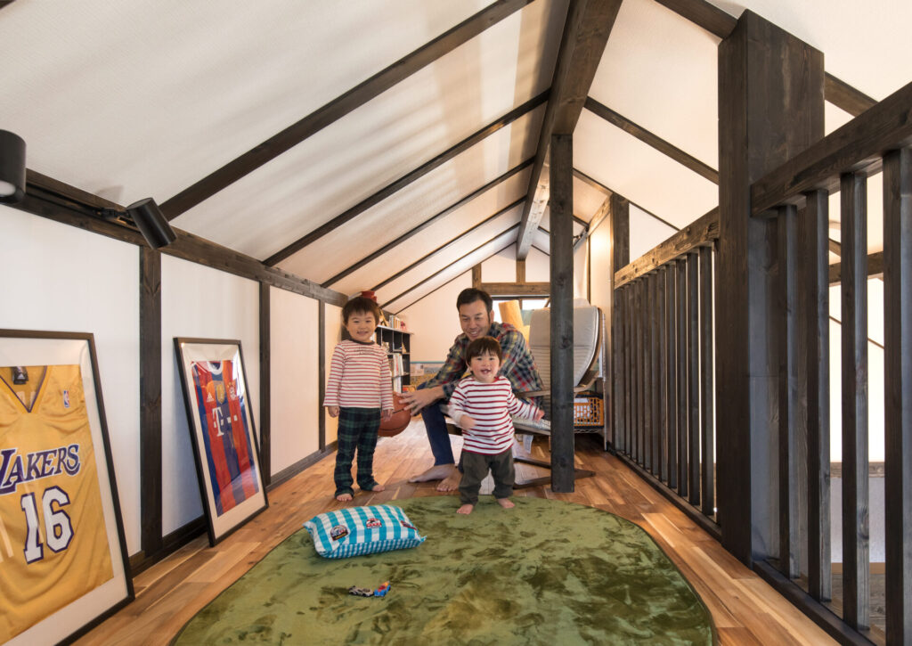 勾配天井が楽しい秘密基地のような空間。お父さんの趣味も、子供との遊びも叶える特別な場所です。