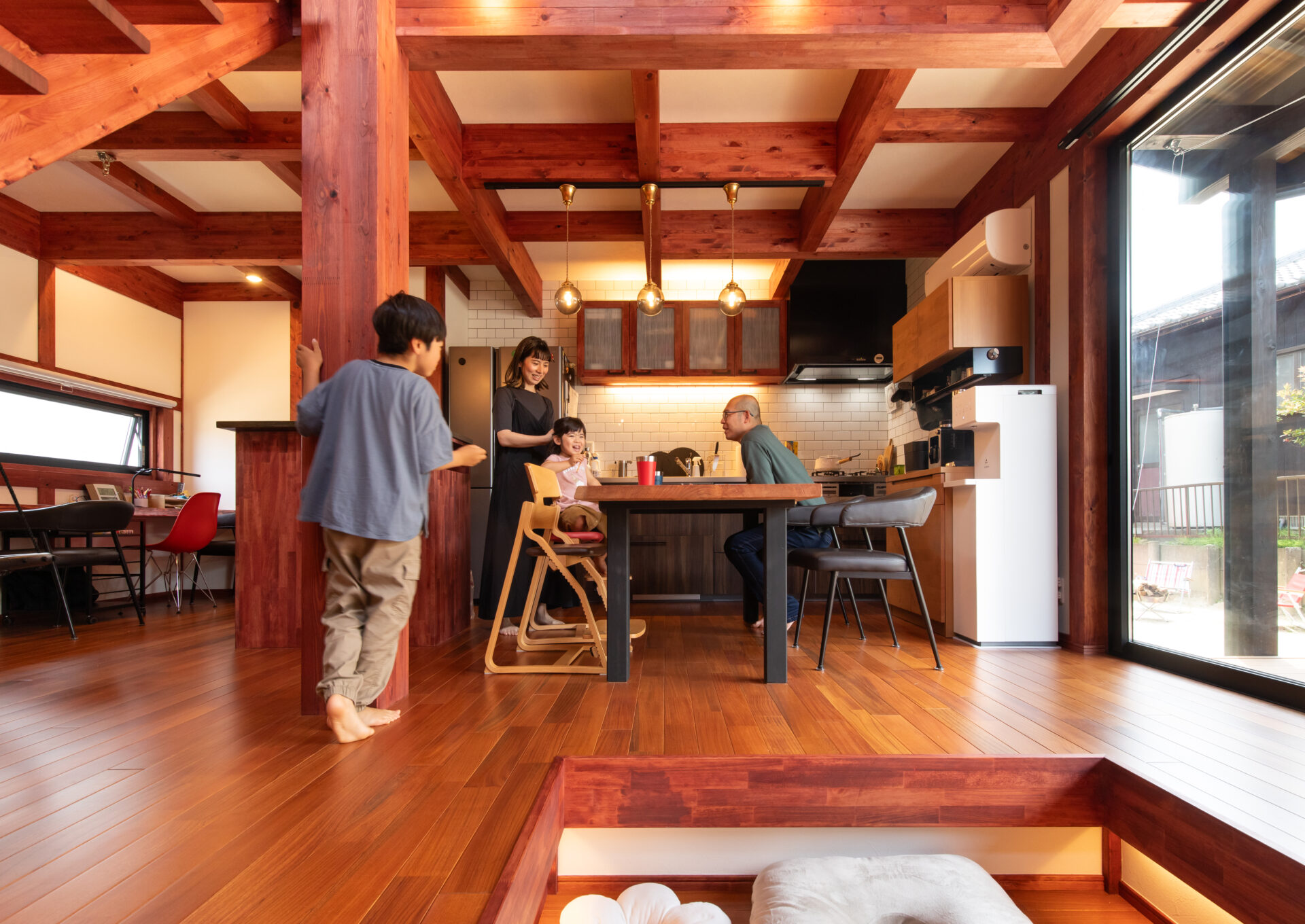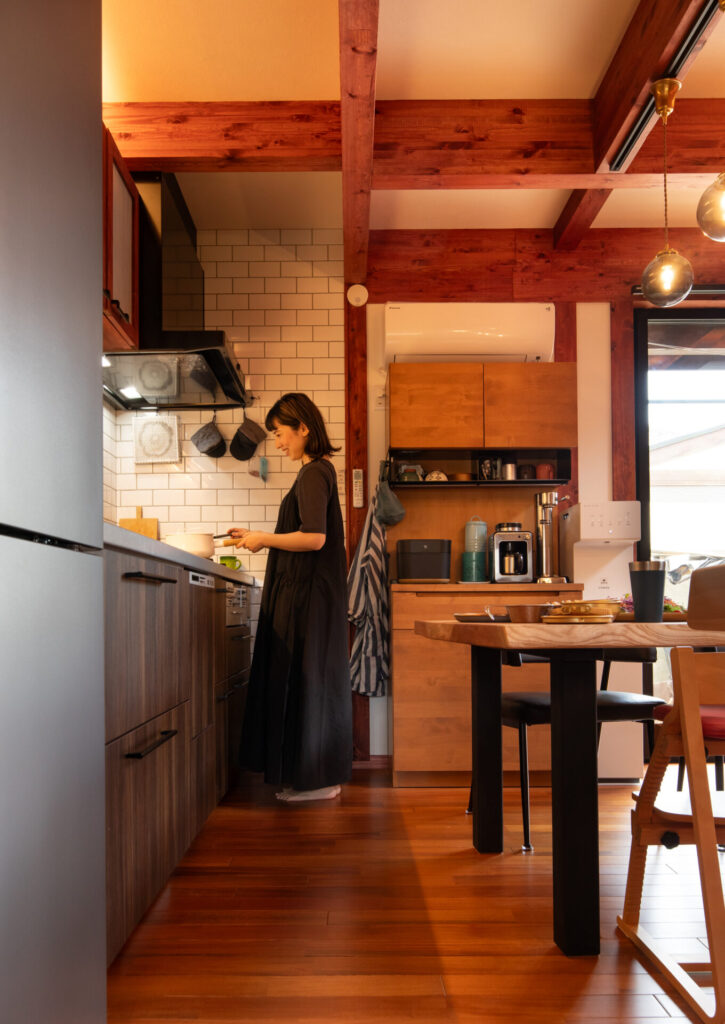 力強い現しの梁が印象的なダイニングキッチン。大きな窓から光が差し込み、家族の会話が自然と生まれる住まいの中心。