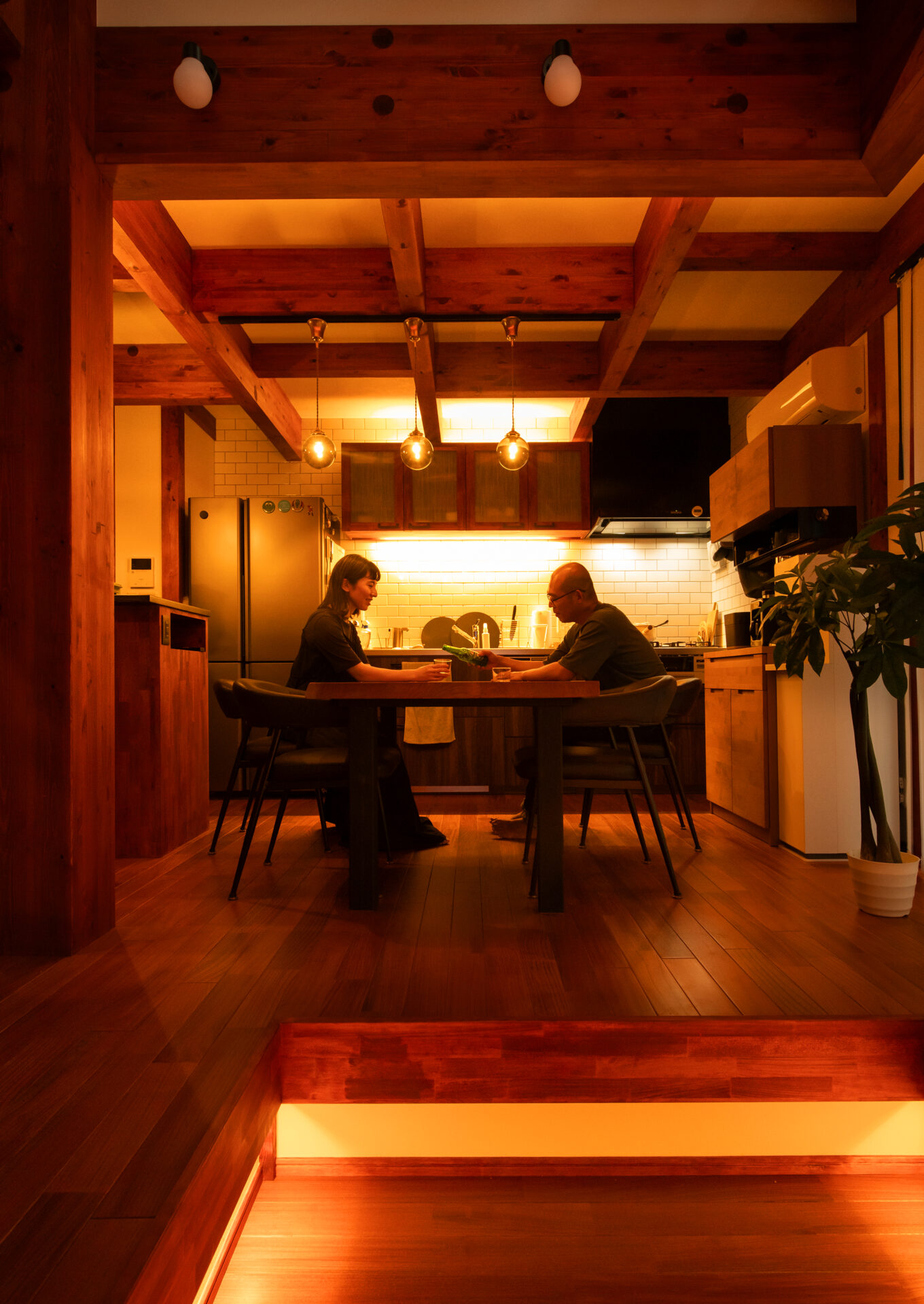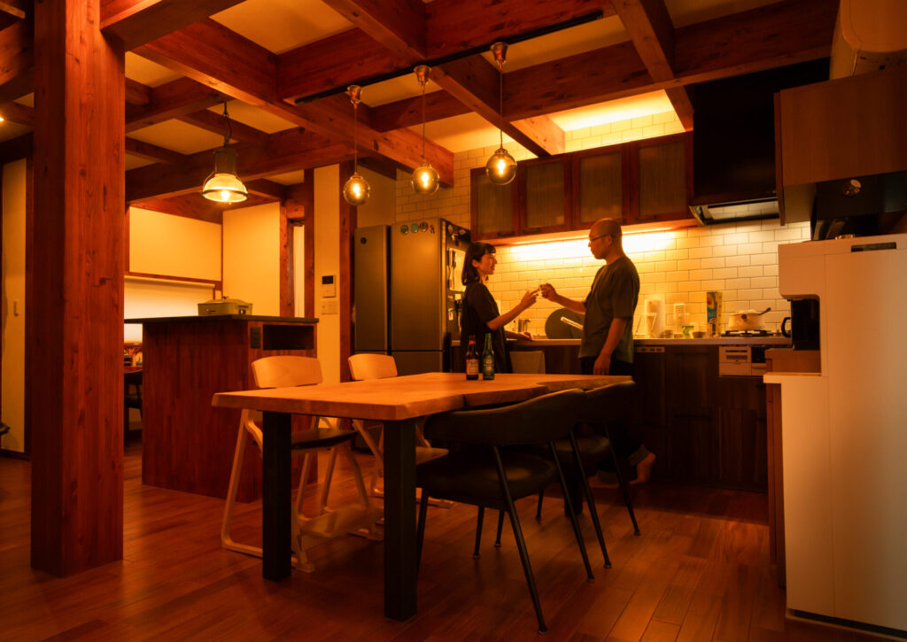 力強い梁の陰影とキッチンの灯りが幻想的な夜のLDK。間接照明が木の重厚感と温かみを引き出し、上質な時間を演出します。