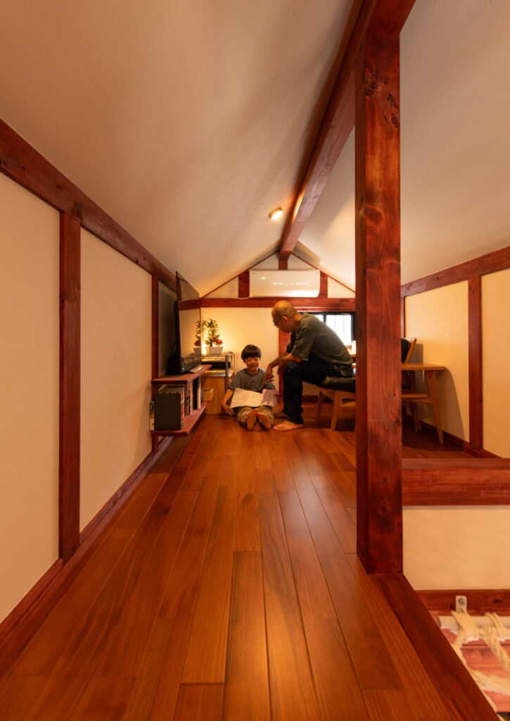 勾配天井に包まれた隠れ家のような小屋裏。温かな照明がプライベートな雰囲気を演出し、自分だけの時間を満喫できます。
