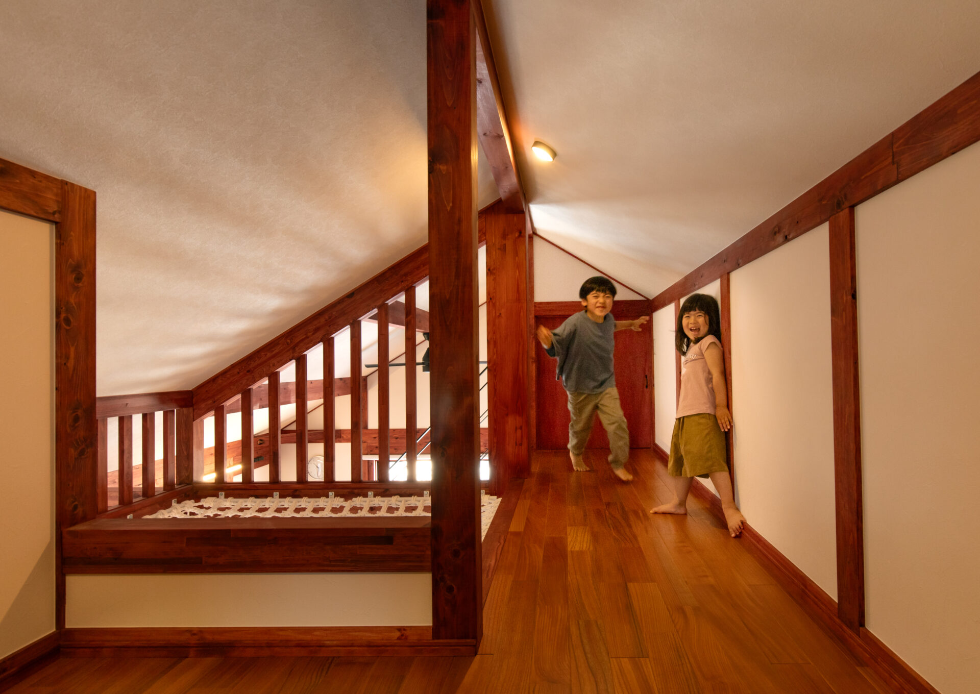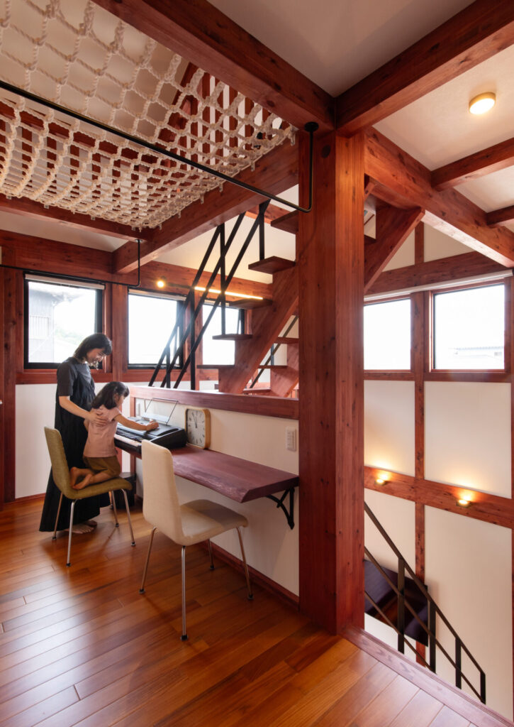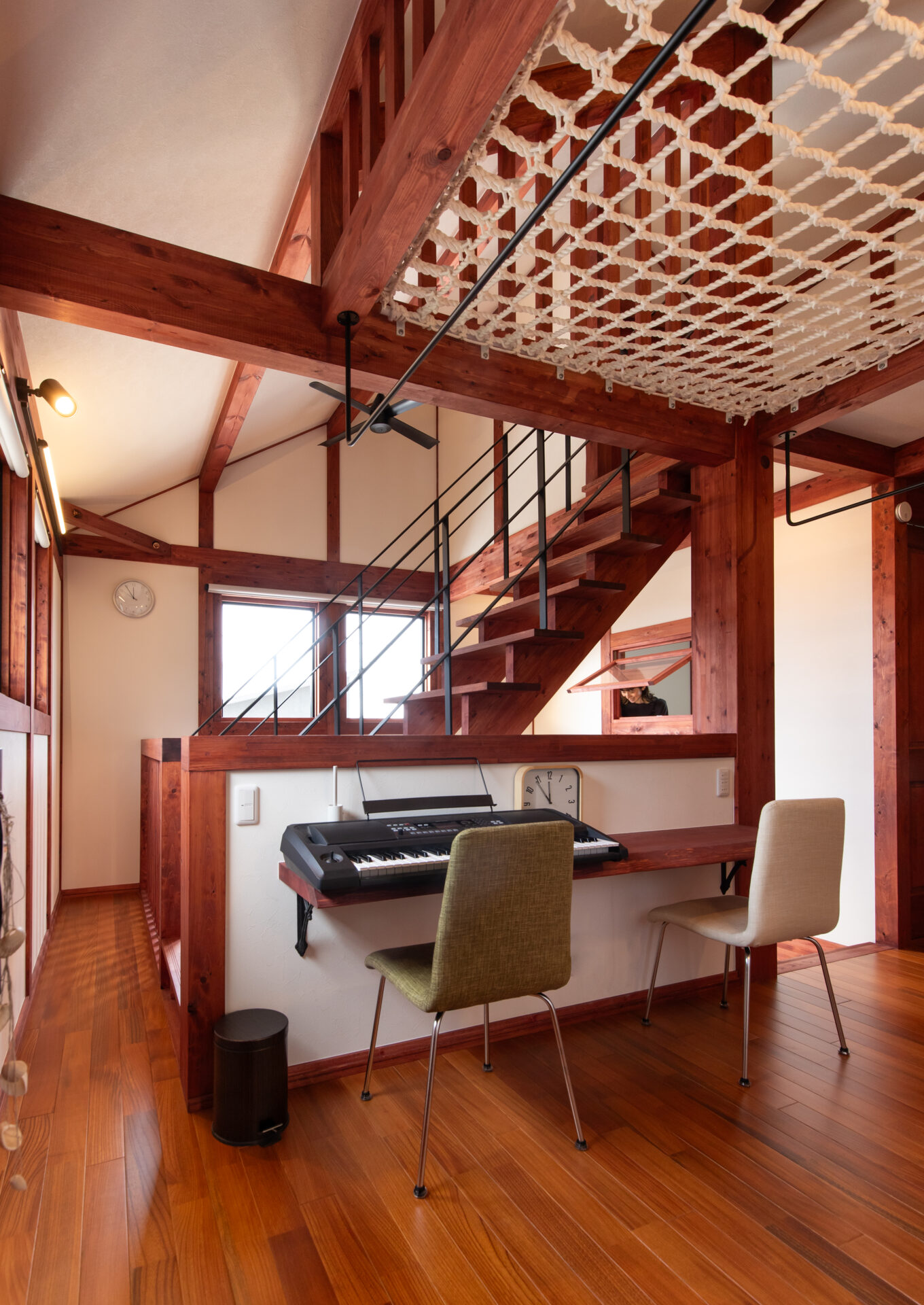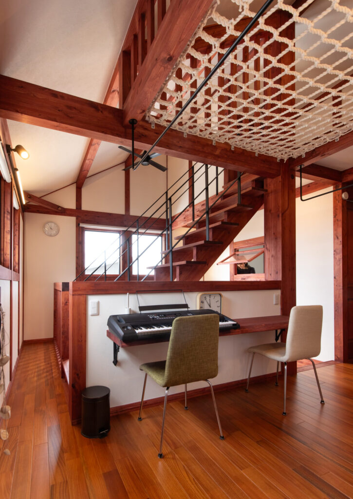 吹き抜けの開放感を高めるユニークなネットフロア。家族が自然と集まり、くつろぎや会話を楽しむ遊び心あふれる空間です。
