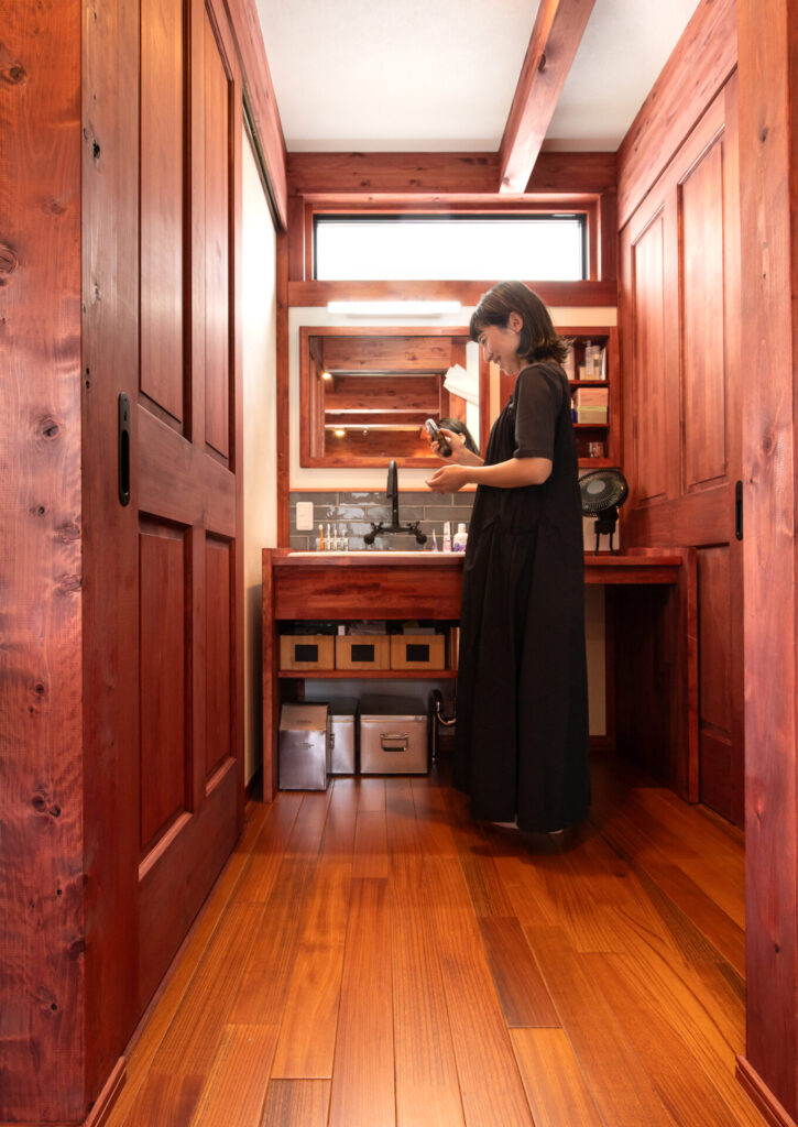 まるで家具のような佇まいの造作洗面台。木の温もりにタイルや水栓を組み合わせた、住まい手の個性が光る空間です。