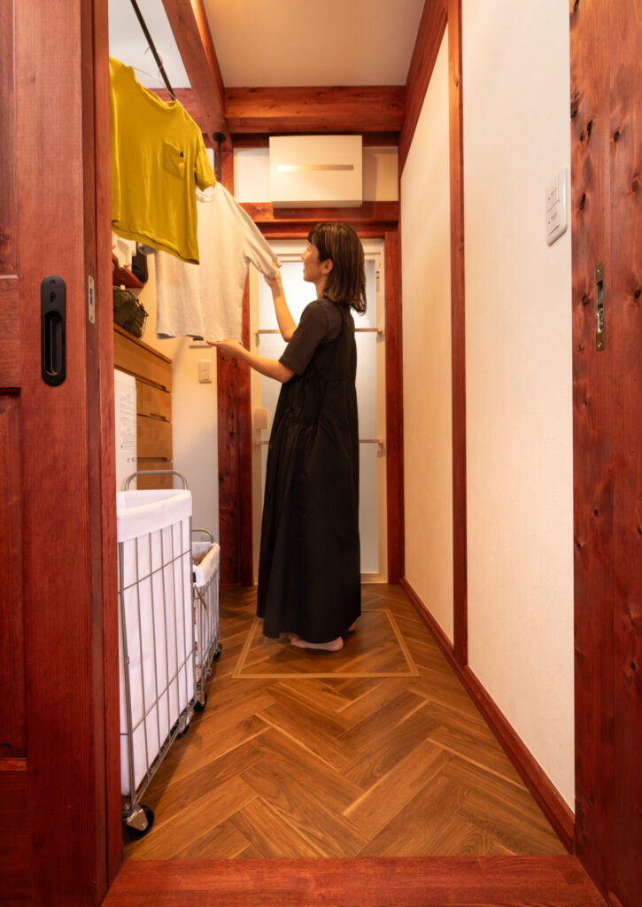 家事動線を考慮した使いやすいランドリー。木の温もりあふれる空間で、日々の家事も快適にこなせます。