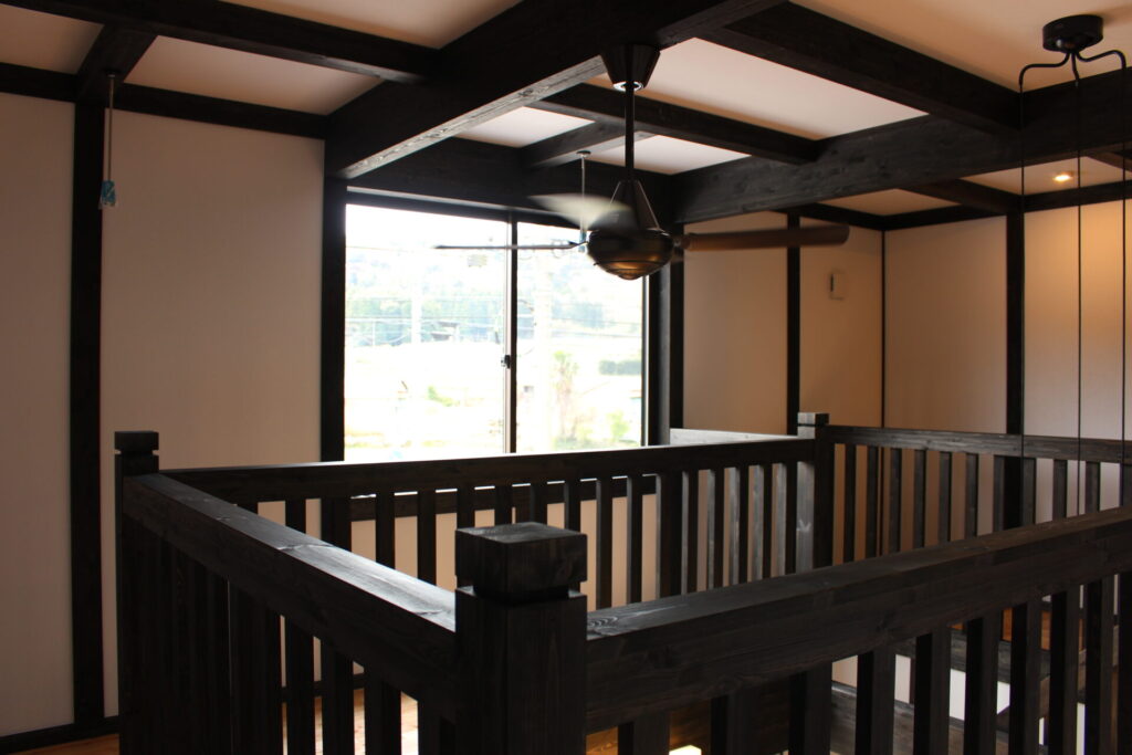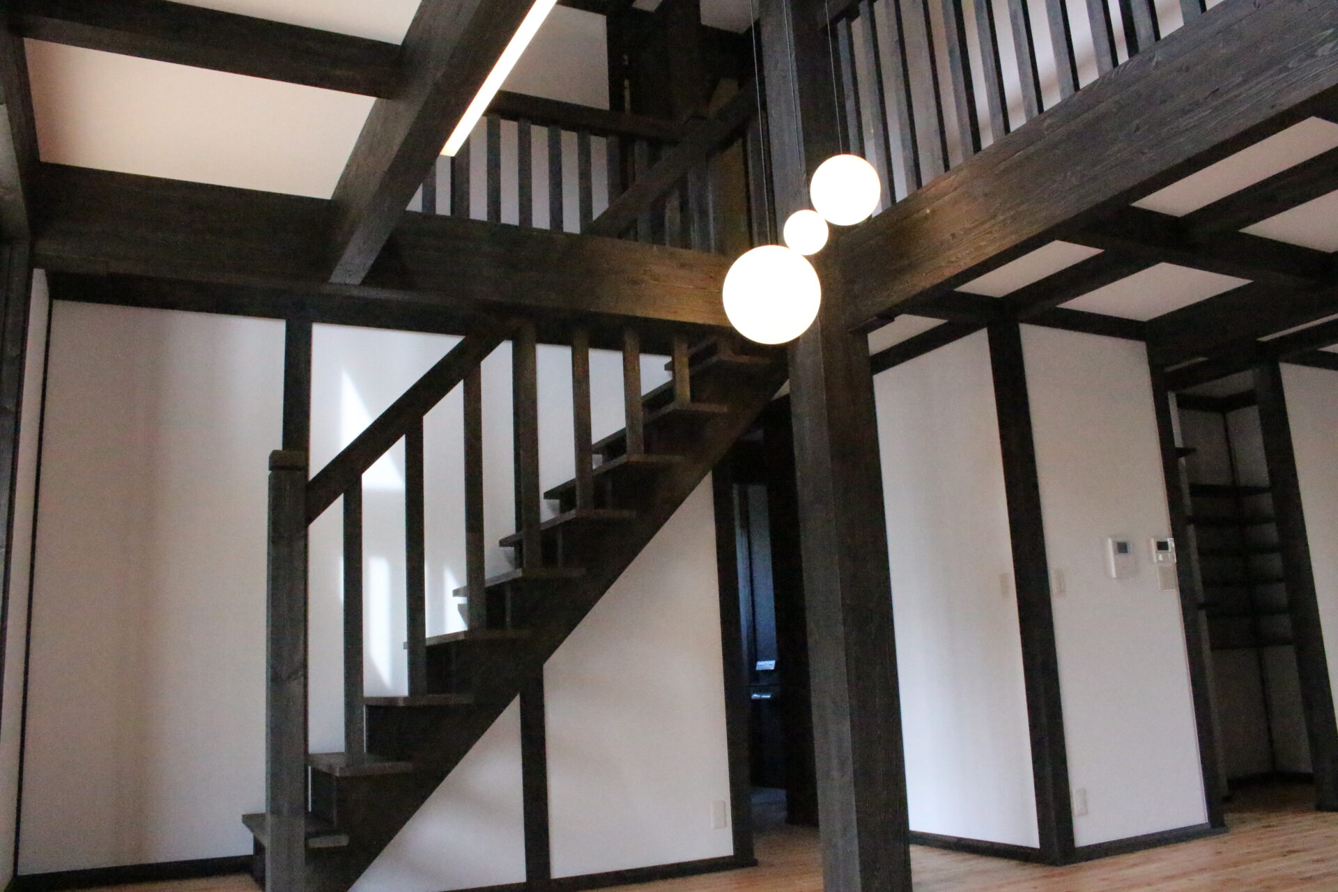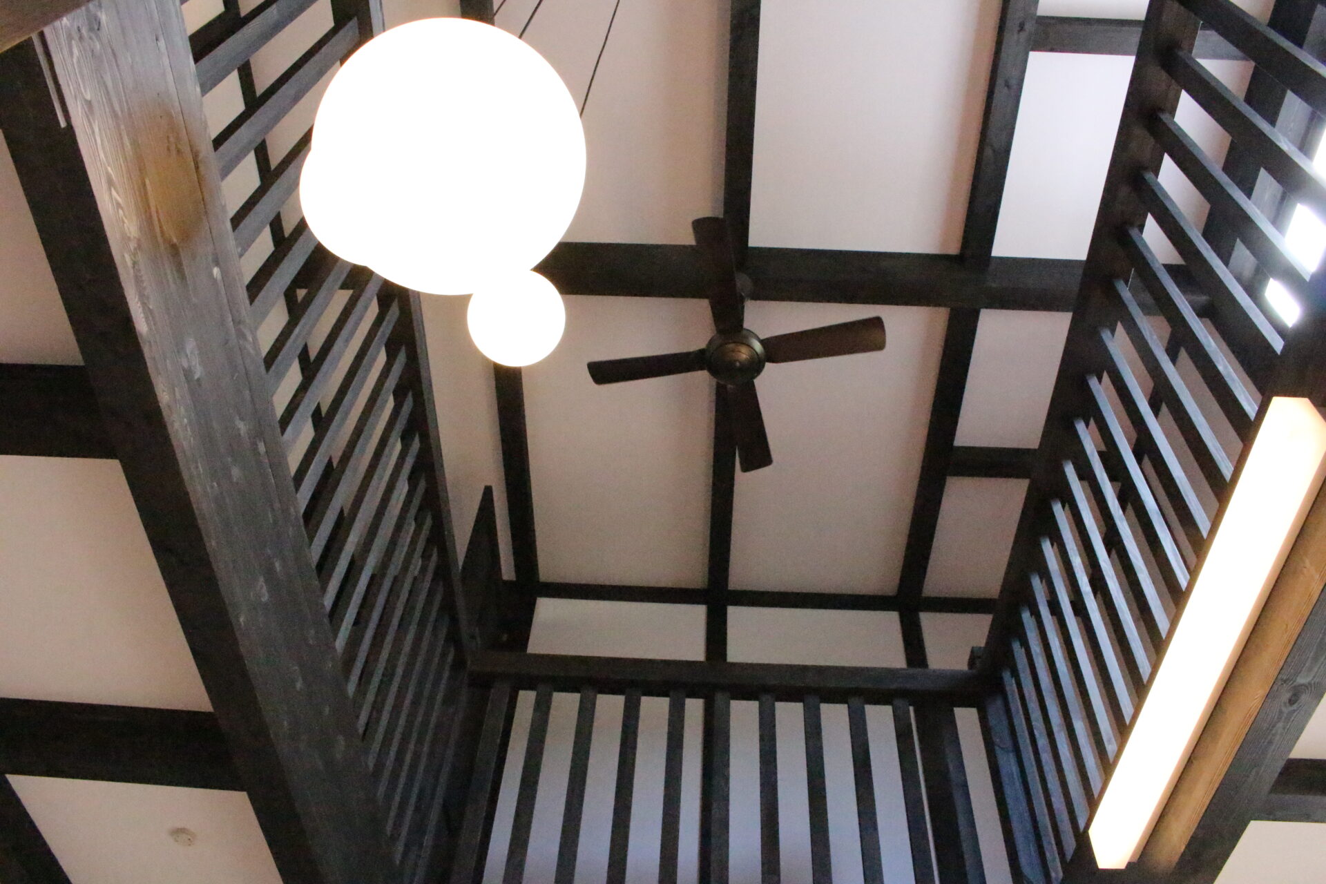 大小の丸いペンダントライトとシーリングファンが、黒い梁の格子の中に浮かびます。1階から見上げると、住まいのこだわりがぎゅっと詰まった景色が広がります。