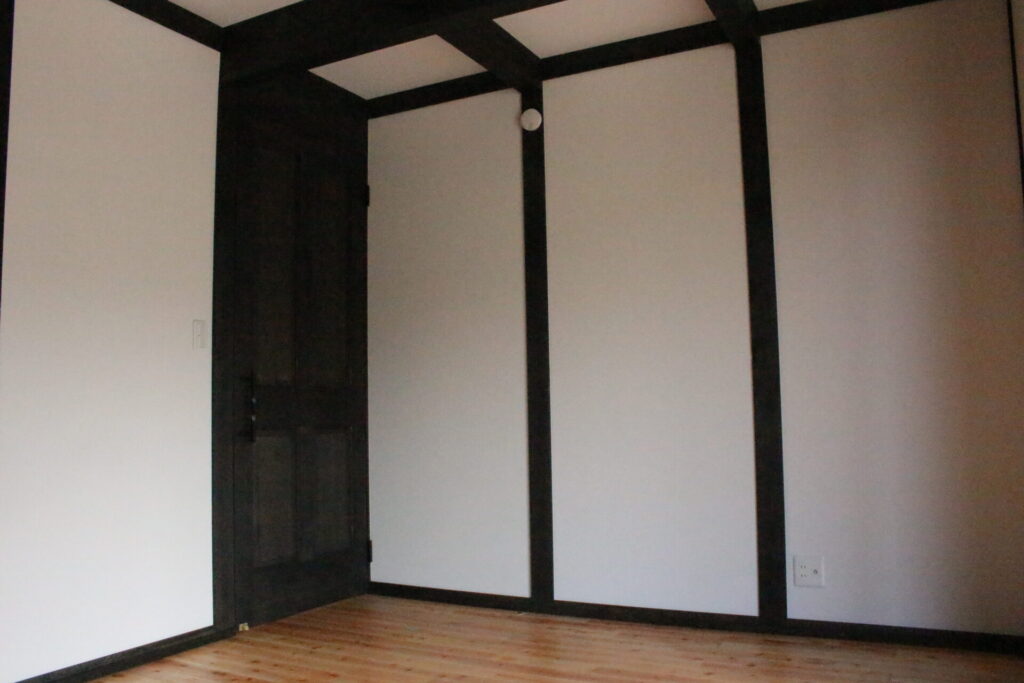 漆黒の柱と純白の壁が生み出す、潔いモノトーンの空間。余白を大切にした真壁づくりが、シンプルの中に確かな品格を宿します。