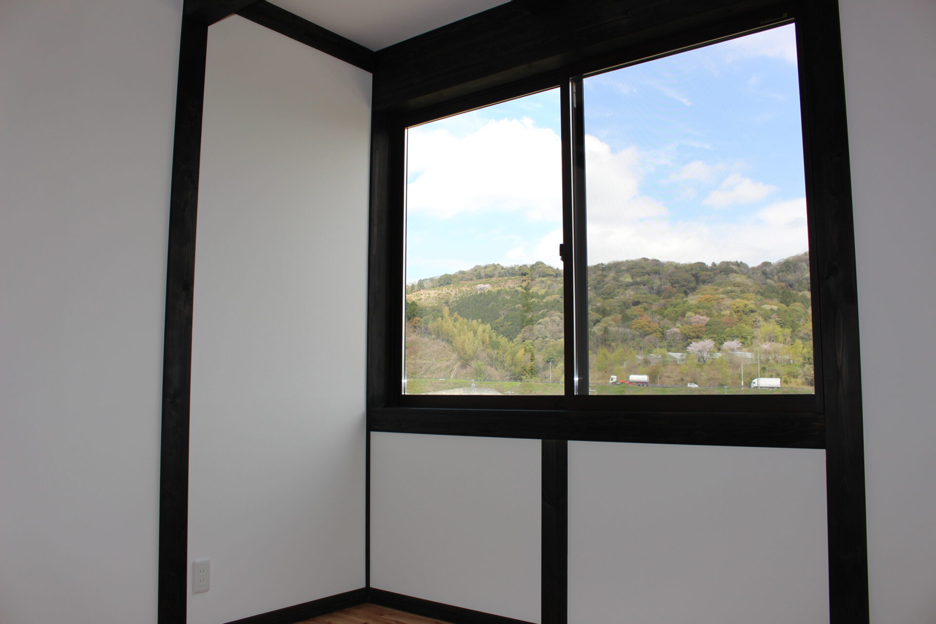 コーナーに設けた大窓が、山並みと青空をそのまま切り取ります。黒い柱が額縁となり、季節ごとに移ろう自然の風景を絵のように楽しめます。