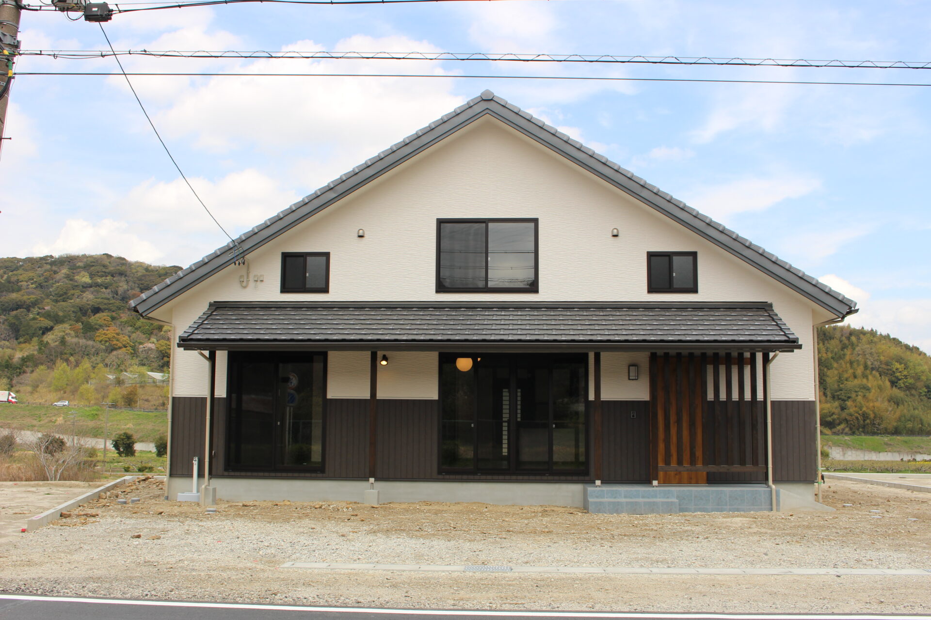 切妻屋根と深い軒が、日本の住まいの原風景を思わせる堂々とした外観。縦格子の玄関まわりが上品なアクセントとなり、背景の山並みとも自然に調和します。