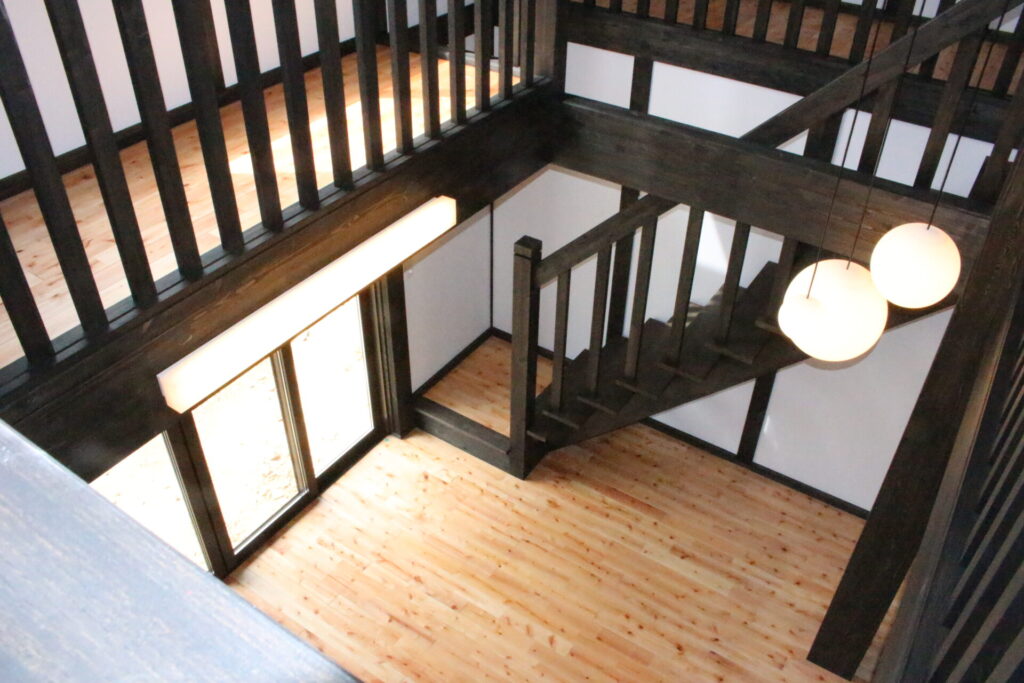 上階から見下ろすと、階段・手すり・丸いペンダントライトが幾何学的な美しさを描きます。光が床に落ちる様子が、空間の豊かさをそのまま伝えます。