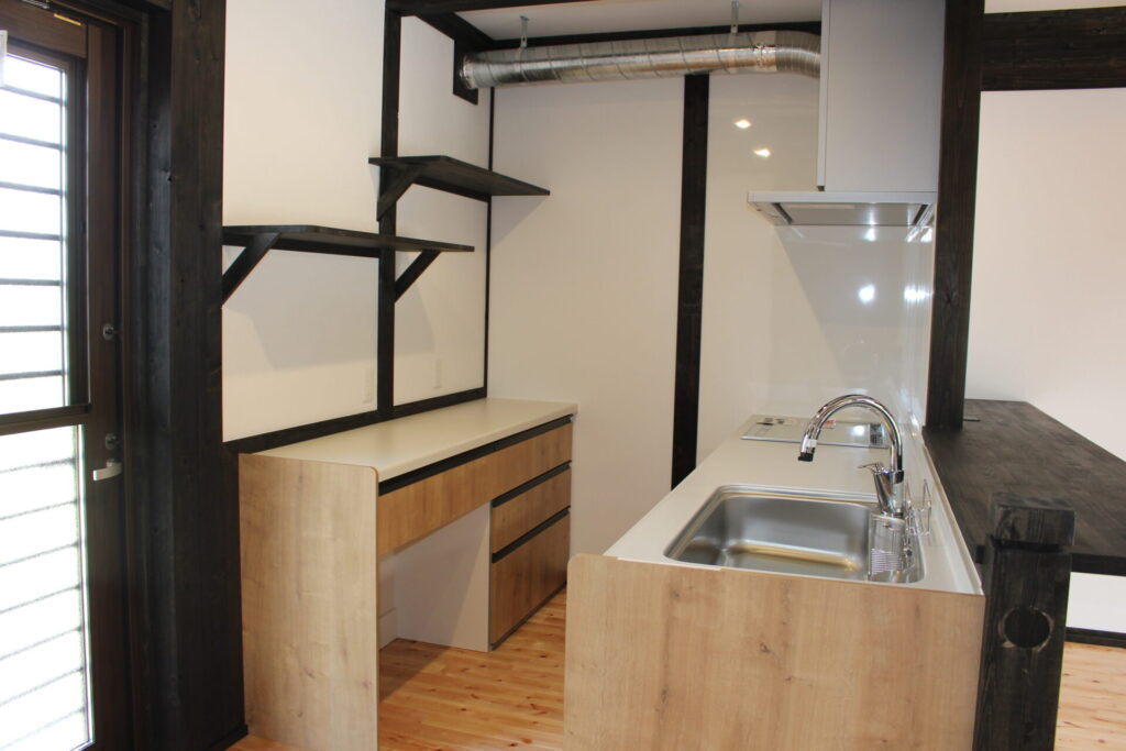 アイアンのオープン棚と露出ダクトが、木の家にスタイリッシュなアクセントを加えます。使い勝手と見た目を両立した、料理好きのためのこだわりのキッチンです。
