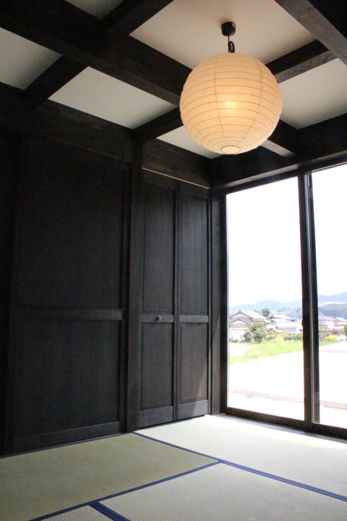 黒一色の壁と丸い和紙照明が、静謐で格調ある和室をつくり出します。大きな窓からは山と空が広がり、畳に腰を下ろすたびに深い安らぎを感じます。